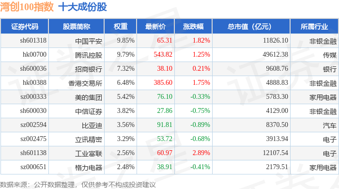 证券之星消息,1月27日,湾创100(980001)指数报收于1538.84点,涨0.6%,成交2056.38亿元,换手率1.59%。当日该指数成份股中,上涨的有50家,鹏鼎控股以5.97%的涨幅领涨,下跌的有50家,天赐材料以4.17%的跌幅领跌。