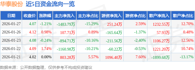 证券之星消息,截至2026年1月27日收盘,华泰股份(600308)报收于4.07元,下跌1.21%,换手率1.58%,成交量23.89万手,成交额9702.08万元。