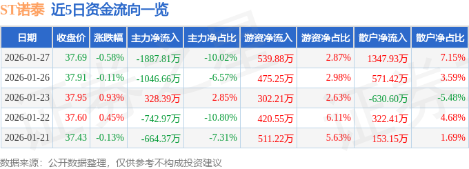 证券之星消息,截至2026年1月27日收盘,ST诺泰(688076)报收于37.69元,下跌0.58%,换手率1.59%,成交量5.03万手,成交额1.88亿元。