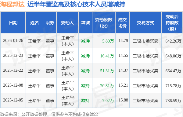 海程邦达近半年内的董监高及核心技术人员增减持详情如下: