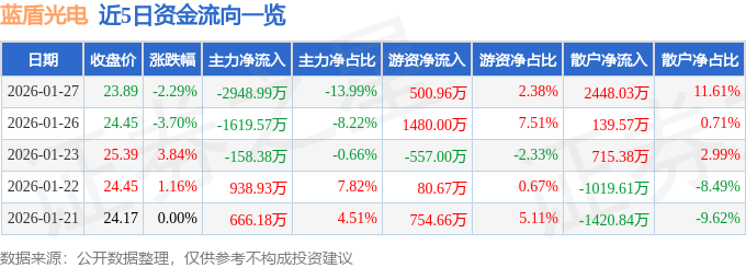证券之星消息,截至2026年1月27日收盘,蓝盾光电(300862)报收于23.89元,下跌2.29%,换手率5.9%,成交量8.93万手,成交额2.11亿元。