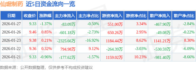证券之星消息,截至2026年1月27日收盘,仙琚制药(002332)报收于9.33元,下跌1.37%,换手率1.8%,成交量17.69万手,成交额1.65亿元。