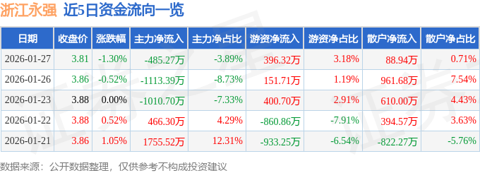 证券之星消息,截至2026年1月27日收盘,浙江永强(002489)报收于3.81元,下跌1.3%,换手率1.72%,成交量32.9万手,成交额1.25亿元。