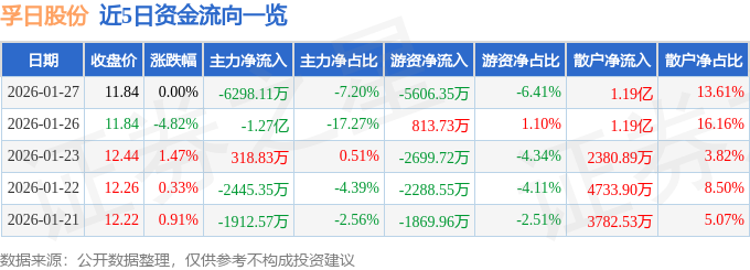 证券之星消息,截至2026年1月27日收盘,孚日股份(002083)报收于11.84元,上涨0.0%,换手率8.04%,成交量76.1万手,成交额8.75亿元。