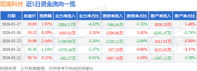 证券之星消息,截至2026年1月27日收盘,固高科技(301510)报收于39.89元,上涨1.97%,换手率6.47%,成交量18.06万手,成交额6.99亿元。