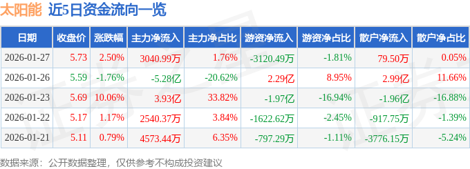 证券之星消息,截至2026年1月27日收盘,太阳能(000591)报收于5.73元,上涨2.5%,换手率7.88%,成交量309.32万手,成交额17.24亿元。