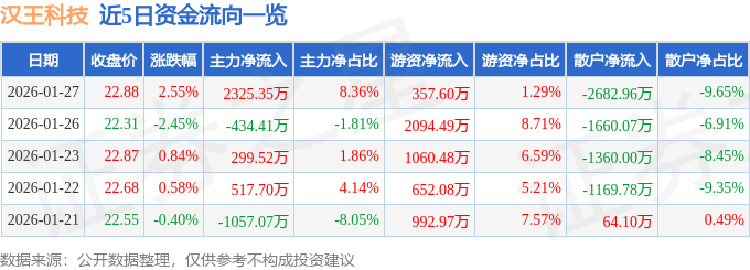 证券之星消息,截至2026年1月27日收盘,汉王科技(002362)报收于22.88元,上涨2.55%,换手率6.0%,成交量12.46万手,成交额2.78亿元。