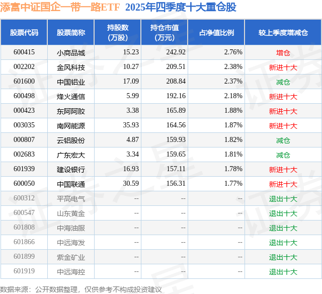 添富中证国企一带一路ETF基金成立于2019年11月6日,基金经理为董瑾 孙浩,基金跟踪标的为中证国企一带一路指数,成立以来超额回报为22.35%,近一个月超额回报为-0.06%。最新披露的基金持仓数据显示,截止2025年12月31日,该基金第一大重仓股为小商品城(600415),持股占比为2.76%。