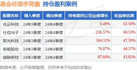 李育鑫管理的广发量化多因子混合A基金在24年3季度买入仕佳光子,在持有1个季度后在24年4季度卖出。持有期间的估算收益率为60.53%,持有期间仕佳光子在2023年到2024年的年报归属净利润增幅达236.57%。