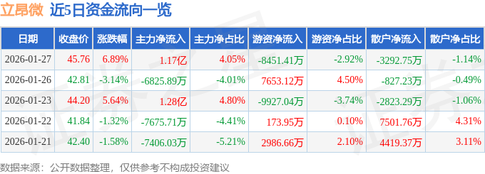 证券之星消息,截至2026年1月27日收盘,立昂微(605358)报收于45.76元,上涨6.89%,换手率9.65%,成交量64.77万手,成交额28.99亿元。