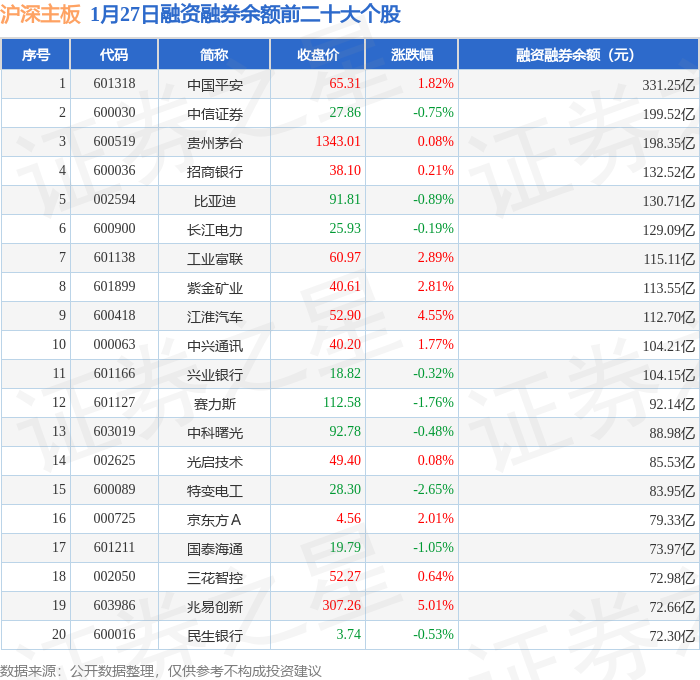 沪深主板融资融券余额前三分别为:中国平安(601318)融资融券余额331.25亿元、中信证券(600030)融资融券余额199.52亿元、贵州茅台(600519)融资融券余额198.35亿元,前20具体见下表:
