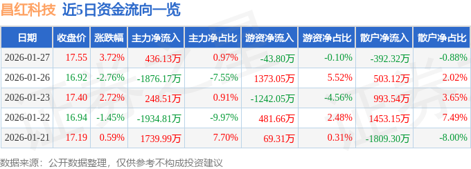证券之星消息,截至2026年1月27日收盘,昌红科技(300151)报收于17.55元,上涨3.72%,换手率7.14%,成交量26.3万手,成交额4.48亿元。