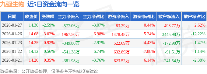 证券之星消息,截至2026年1月27日收盘,九强生物(300406)报收于14.3元,下跌2.59%,换手率3.12%,成交量13.24万手,成交额1.88亿元。