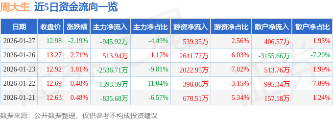 1月27日的资金流向数据方面,主力资金净流出945.92万元,占总成交额4.49%,游资资金净流入539.35万元,占总成交额2.56%,散户资金净流入406.57万元,占总成交额1.93%。