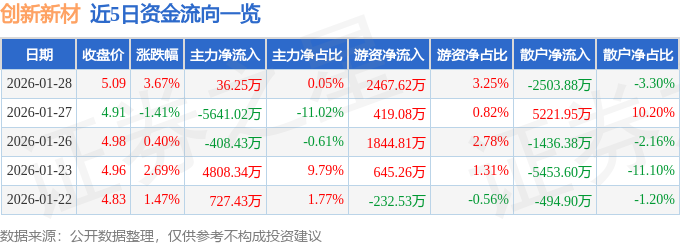 证券之星消息,截至2026年1月28日收盘,创新新材(600361)报收于5.09元,上涨3.67%,换手率4.01%,成交量150.45万手,成交额7.58亿元。