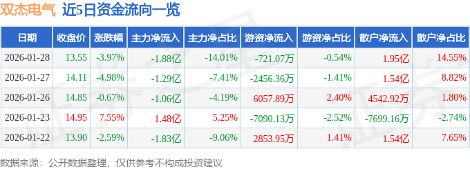 证券之星消息,截至2026年1月28日收盘,双杰电气(300444)报收于13.55元,下跌3.97%,换手率15.81%,成交量98.24万手,成交额13.42亿元。