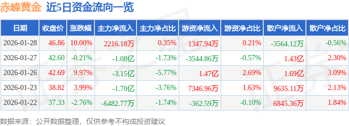 证券之星消息,赤峰黄金1月28日涨停收盘,收盘价46.86元。该股于14点34分涨停,1次打开涨停,截止收盘封单资金为1026.61万元,占其流通市值0.01%。