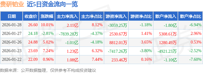1月28日的资金流向数据方面,主力资金净流入2.11亿元,占总成交额8.12%,游资资金净流出3059.25万元,占总成交额1.18%,散户资金净流出1.8亿元,占总成交额6.94%。