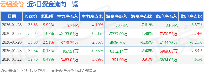 证券之星消息,云铝股份1月28日涨停收盘,收盘价36.33元。该股于13点0分涨停,13次打开涨停,截止收盘封单资金为2638.43万元,占其流通市值0.02%。