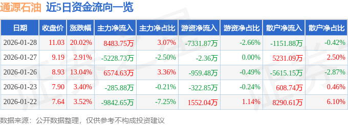 证券之星消息,通源石油1月28日涨停收盘,收盘价11.03元。该股于11点15分涨停,5次打开涨停,截止收盘封单资金为3487.13万元,占其流通市值0.54%。