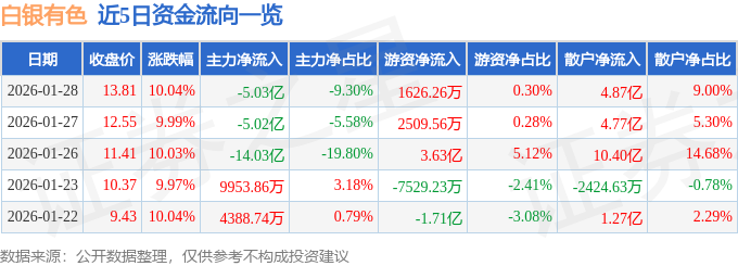 证券之星消息,白银有色1月28日涨停收盘,收盘价13.81元。该股于10点2分涨停,2次打开涨停,截止收盘封单资金为7.79亿元,占其流通市值0.76%。