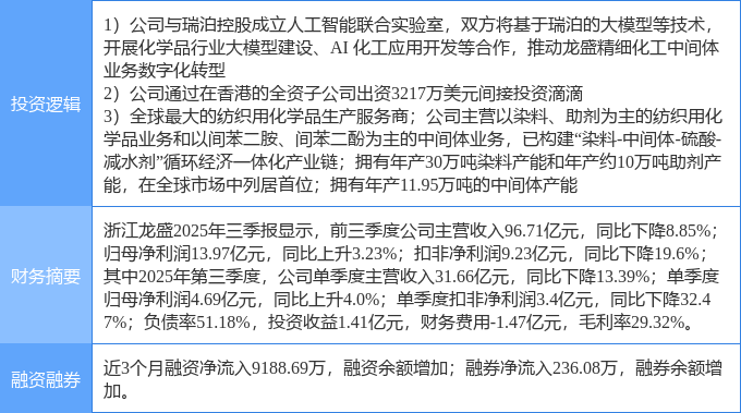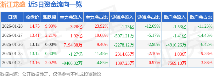 证券之星消息,浙江龙盛1月28日涨停收盘,收盘价14.75元。该股于9点34分涨停,1次打开涨停,截止收盘封单资金为2.53亿元,占其流通市值0.53%。