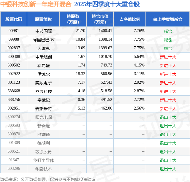 根据2025基金年报公募基金重仓股数据,重仓该股的公募基金共4家,其中持有数量最多的公募基金为中银基金的中银科技创新一年定开混合。中银科技创新一年定开混合目前规模为1.8亿元,最新净值1.0628(1月23日),较上一交易日上涨1.35%,近一年上涨70.65%。该公募基金现任基金经理为杨雷。杨雷在任的基金产品包括:中银数字经济混合A,管理时间为2024年11月29日至今,期间收益率为86.08%;中银先锋半导体混合发起A,管理时间为2026年1月15日至今,期间收益率为2.75%。