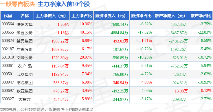 从资金流向上来看,当日一般零售板块主力资金净流出3.82亿元,游资资金净流入664.33万元,散户资金净流入3.75亿元。一般零售板块个股资金流向见下表:
