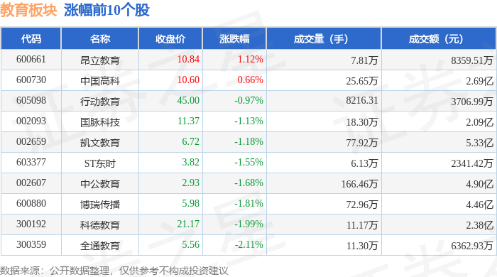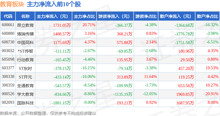 从资金流向上来看,当日教育板块主力资金净流出2.08亿元,游资资金净流出1513.22万元,散户资金净流入2.23亿元。教育板块个股资金流向见下表: