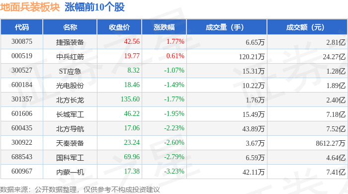 从资金流向上来看,当日地面兵装板块主力资金净流出6.32亿元,游资资金净流入1.13亿元,散户资金净流入5.19亿元。地面兵装板块个股资金流向见下表: