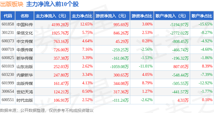 从资金流向上来看,当日出版板块主力资金净流出2.7亿元,游资资金净流入1383.5万元,散户资金净流入2.56亿元。出版板块个股资金流向见下表: