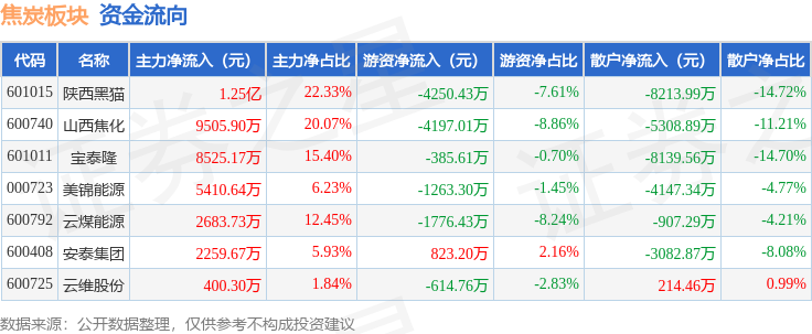 从资金流向上来看,当日焦炭板块主力资金净流入4.12亿元,游资资金净流出1.17亿元,散户资金净流出2.96亿元。焦炭板块个股资金流向见下表: