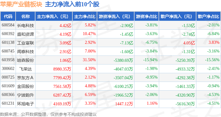 从资金流向上来看,当日苹果产业链板块主力资金净流出49.57亿元,游资资金净流出1.27亿元,散户资金净流入50.84亿元。苹果产业链板块个股资金流向见下表: