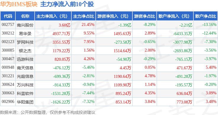 从资金流向上来看,当日华为HMS板块主力资金净流出2.66亿元,游资资金净流入2.24亿元,散户资金净流入4246.97万元。华为HMS板块个股资金流向见下表: