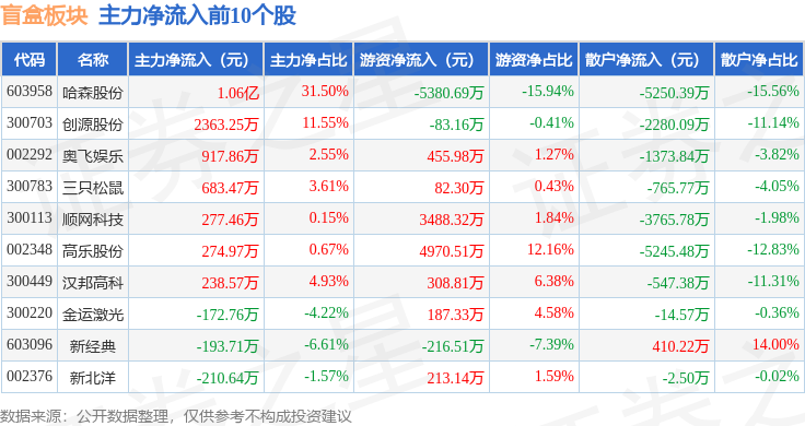 从资金流向上来看,当日盲盒板块主力资金净流出5352.58万元,游资资金净流入1.65亿元,散户资金净流出1.11亿元。盲盒板块个股资金流向见下表: