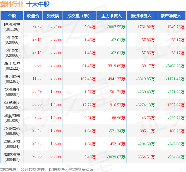 个股表现方面,塑料行业当日领涨股为唯科科技(301196),该股当日报收79.78,上涨3.34%,成交量5.04万,主力资金净流出3007.55万元。科拜尔(920066)以上涨3.23%紧随其后,该股当日成交量1.46万,主力资金净流出62.61万元。除此之外,科拜尔(920066)、浙江众成(002522)、神剑股份(002361)均进入当日牛股之列。具体个股列表见下表: