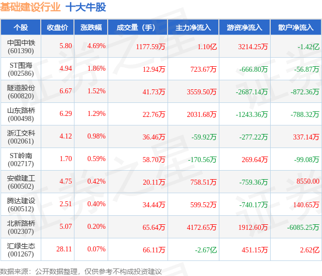 个股表现方面,基础建设行业当日领涨股为中国中铁(601390),该股当日报收5.8,上涨4.69%,成交量1177.59万,主力资金净流入1.1亿元。ST围海(002586)以上涨1.86%紧随其后,该股当日成交量12.94万,主力资金净流入723.67万元。除此之外,隧道股份(600820)、山东路桥(000498)、浙江交科(002061)均进入当日牛股之列。具体个股列表见下表: