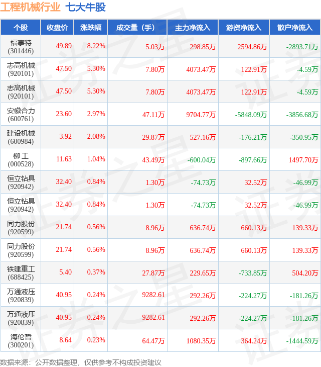 个股表现方面,工程机械行业当日领涨股为福事特(301446),该股当日报收49.89,上涨8.22%,成交量5.03万,主力资金净流入298.85万元。志高机械(920101)以上涨5.3%紧随其后,该股当日成交量7.8万,主力资金净流入4073.47万元。除此之外,志高机械(920101)、安徽合力(600761)、建设机械(600984)均进入当日牛股之列。具体个股列表见下表:
