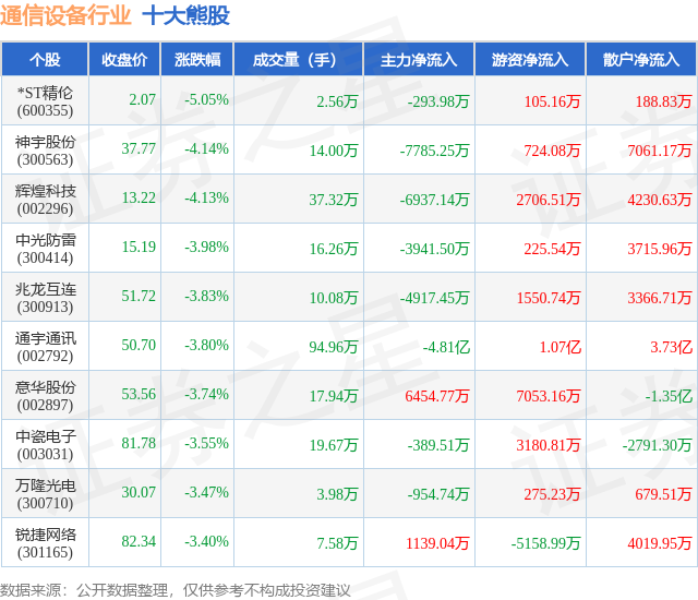 个股表现方面,通信设备行业当日领跌股为*ST精伦(600355),该股当日报收2.07,下跌5.05%,成交量2.56万,主力资金净流出293.98万元。神宇股份(300563)以下跌4.14%紧随其后,该股当日成交量14.0万,主力资金净流出7785.25万元。除此之外,辉煌科技(002296)、中光防雷(300414)、兆龙互连(300913)均进入当日熊股之列。具体个股列表见下表: