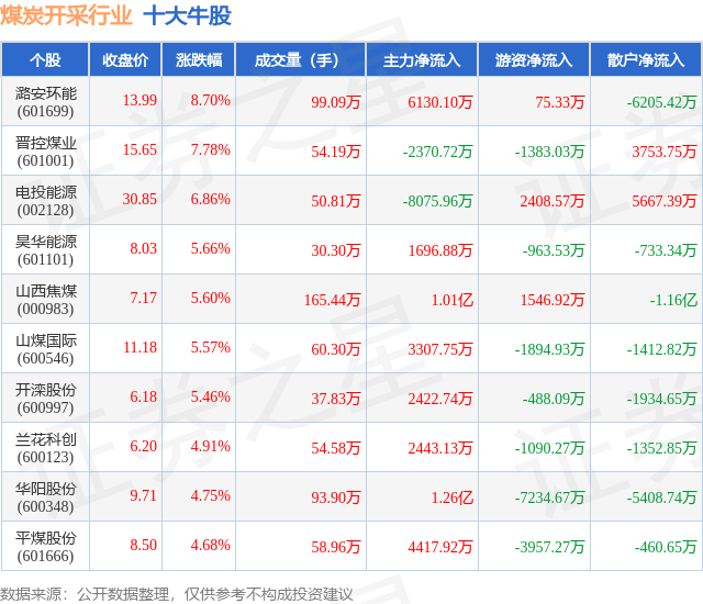 个股表现方面,煤炭开采行业当日领涨股为潞安环能(601699),该股当日报收13.99,上涨8.7%,成交量99.09万,主力资金净流入6130.1万元。晋控煤业(601001)以上涨7.78%紧随其后,该股当日成交量54.19万,主力资金净流出2370.72万元。除此之外,电投能源(002128)、昊华能源(601101)、山西焦煤(000983)均进入当日牛股之列。具体个股列表见下表: