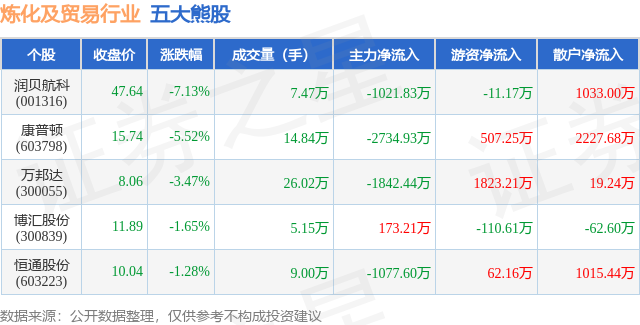 个股表现方面,炼化及贸易行业当日领跌股为润贝航科(001316),该股当日报收47.64,下跌7.13%,成交量7.47万,主力资金净流出1021.83万元。康普顿(603798)以下跌5.52%紧随其后,该股当日成交量14.84万,主力资金净流出2734.93万元。除此之外,万邦达(300055)、博汇股份(300839)、恒通股份(603223)均进入当日熊股之列。具体个股列表见下表: