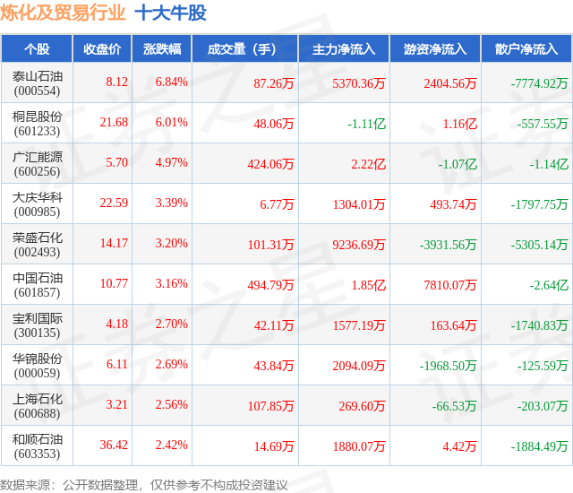 个股表现方面,炼化及贸易行业当日领涨股为泰山石油(000554),该股当日报收8.12,上涨6.84%,成交量87.26万,主力资金净流入5370.36万元。桐昆股份(601233)以上涨6.01%紧随其后,该股当日成交量48.06万,主力资金净流出1.11亿元。除此之外,广汇能源(600256)、大庆华科(000985)、荣盛石化(002493)均进入当日牛股之列。具体个股列表见下表: