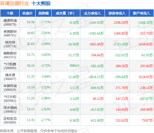 个股表现方面,环境治理行业当日领跌股为通源环境(688679),该股当日报收54.5,下跌7.71%,成交量8.1万,主力资金净流出1141.93万元。卓锦股份(688701)以下跌5.91%紧随其后,该股当日成交量6.39万,主力资金净流出1582.64万元。除此之外,倍杰特(300774)、福鞍股份(603315)、*ST凯鑫(300899)均进入当日熊股之列。具体个股列表见下表: