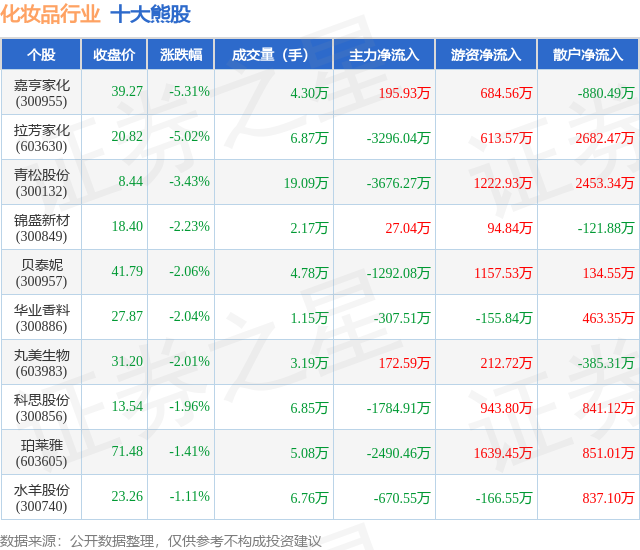个股表现方面,化妆品行业当日领跌股为嘉亨家化(300955),该股当日报收39.27,下跌5.31%,成交量4.3万,主力资金净流入195.93万元。拉芳家化(603630)以下跌5.02%紧随其后,该股当日成交量6.87万,主力资金净流出3296.04万元。除此之外,青松股份(300132)、锦盛新材(300849)、贝泰妮(300957)均进入当日熊股之列。具体个股列表见下表: