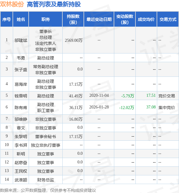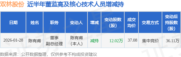 双林股份近半年内的董监高及核心技术人员增减持详情如下: