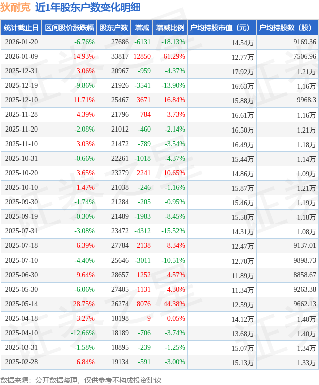 从股价来看,2026年1月9日至2026年1月20日,狄耐克区间跌幅为6.76%,在此期间股东户数减少6131.0户,减幅为18.13%。