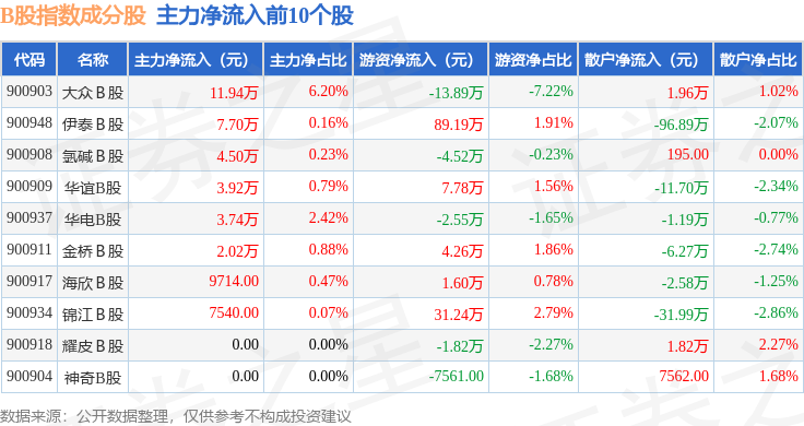 资金流向方面,B股指数(000003)成份股当日主力资金净流出合计84.96万元,游资资金净流入合计29.1万元,散户资金净流入合计55.86万元。成份股资金流向详情见下表: