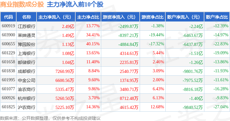 资金流向方面,商业指数(000005)成份股当日主力资金净流出合计6.15亿元,游资资金净流入合计10.47亿元,散户资金净流出合计4.31亿元。成份股资金流向详情见下表: