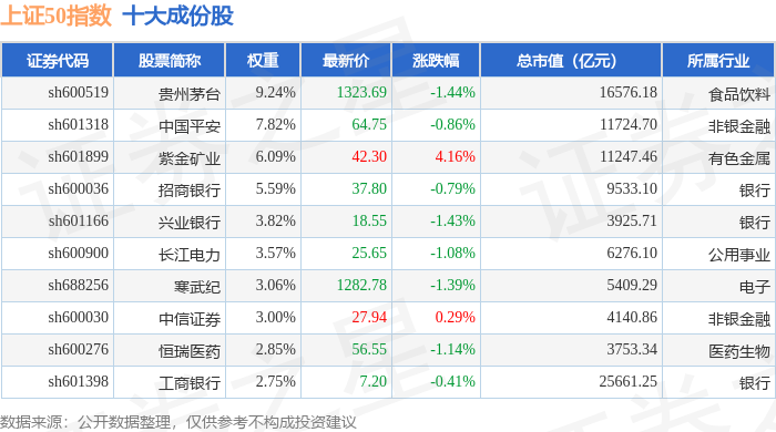 上证50(000016)指数十大成份股详情如下: