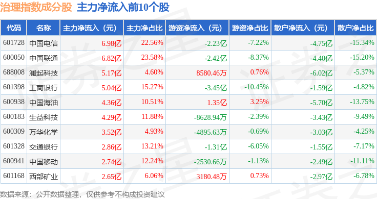 资金流向方面,治理指数(000019)成份股当日主力资金净流出合计23.11亿元,游资资金净流入合计20.77亿元,散户资金净流入合计2.33亿元。成份股资金流向详情见下表: